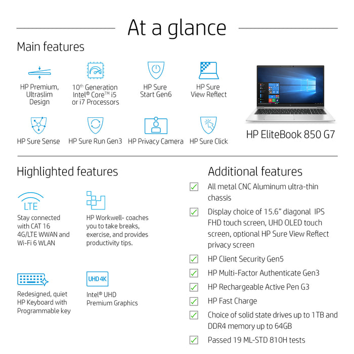 HP EliteBook 850 G7. Product type: Laptop, Form factor: Clamshell. Processor family: Intel® Core™ i7, Processor model: i7-10510U, Processor frequency: 1.8 GHz. Display diagonal: 39.6 cm (15.6"), HD type: Full HD, Display resolution: 1920 x 1080 pixels. Internal memory: 16 GB, Internal memory type: DDR4-SDRAM. Total storage capacity: 512 GB, Storage media: SSD. Mobile network generation: 4G. Operating system installed: Windows 10 Pro. Product colour: Silver